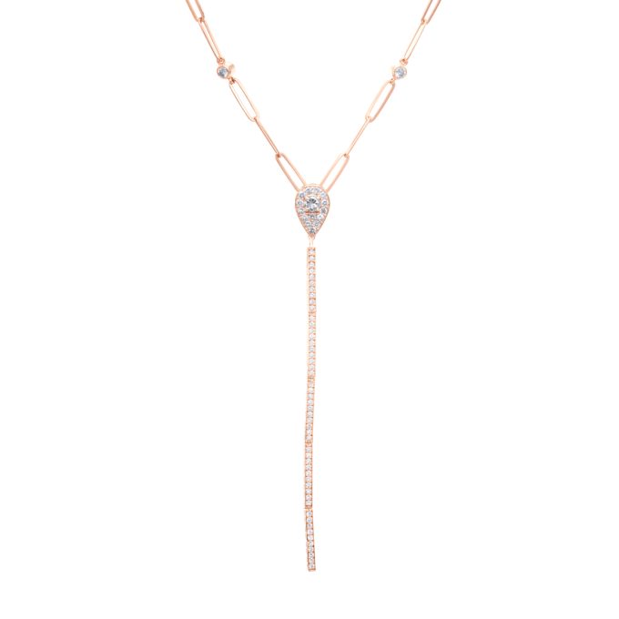 Our best seller necklace. This 2 in 1 necklace can be worn as a single pear illusion shape goutte on a paper clip chain. Or can be worn as a long diamond drip connected to to the paper clip chain. The diamond drip is very easy to attach and de- attach. Suitable for day and night.