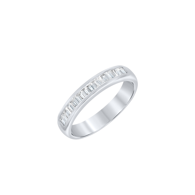 Rings, Wedding BandsClassic half eternity band with baguette diamonds in channel setting studded in 18k rose gold