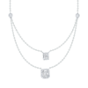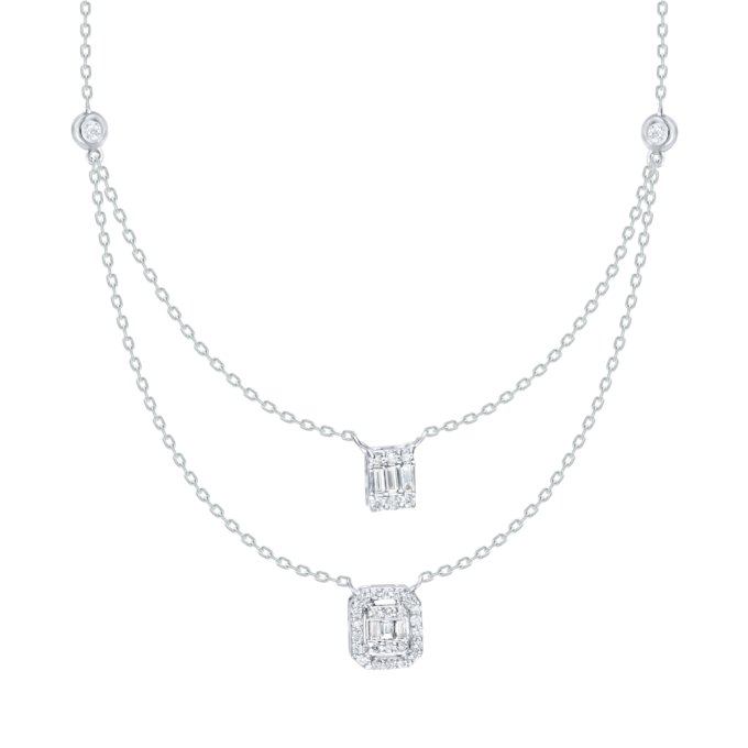 Elegant white chain necklace with two diamond charms hanging. Giving an illusion of an Emerald solitaire made with brilliant round and baguette hanging on a chic white gold chain. A gold clasp and a scale of two openings will make it easy to adjust the size of the necklace.