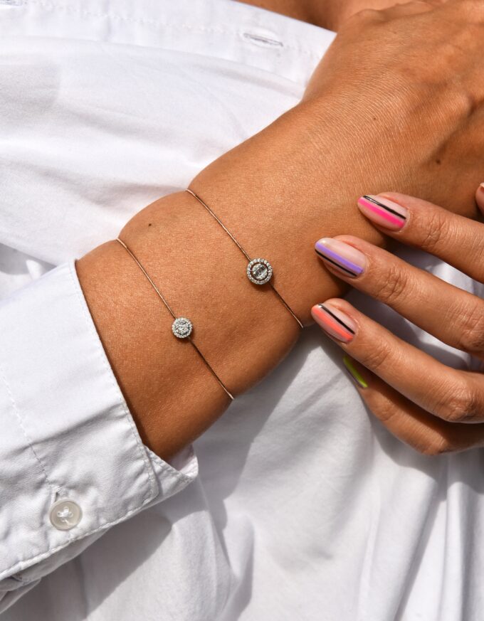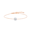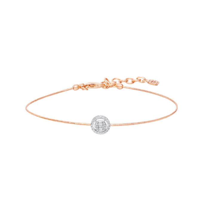 Bracelet, Floating Carat BraceletThin beautiful bangle with an illusion of solitaire diamond created by fine round and baguette centred by halo of fine diamonds with 18k rose gold