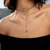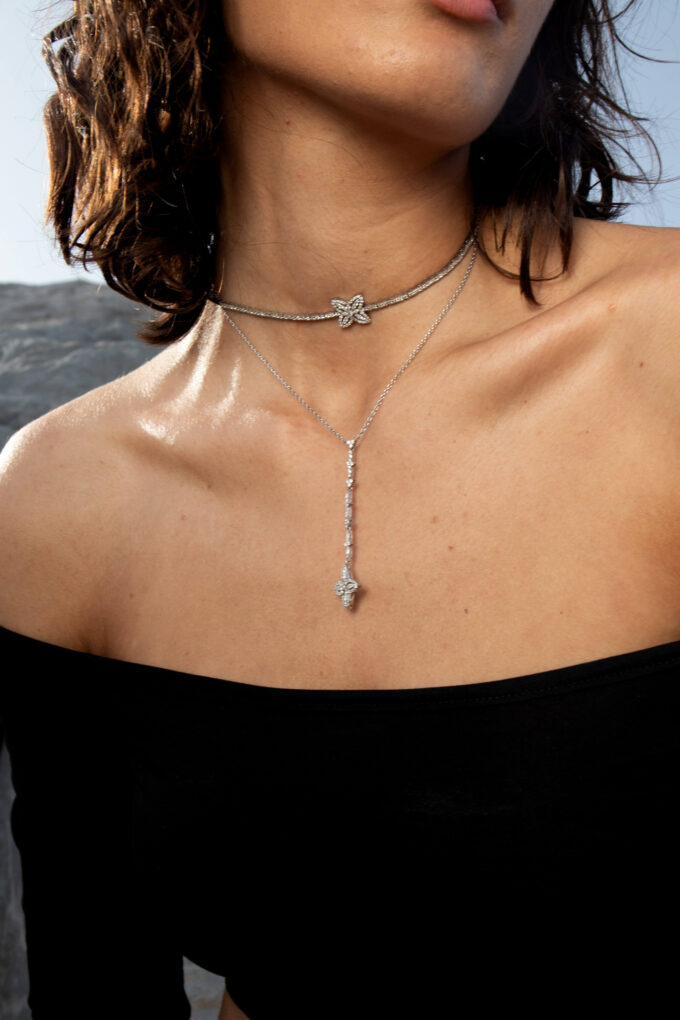 Hanging off a 18k white gold chain. This diamond drip can be matched with the Floraque chocker and Floraque ring.
