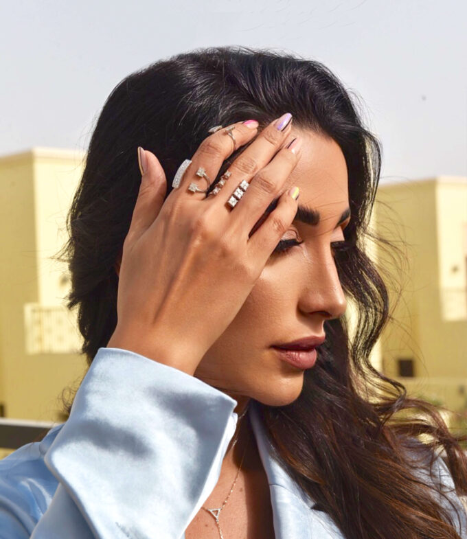 Beautiful ring with champagne and ice cubes created with princess cut diamonds floating on finger with 18k white gold