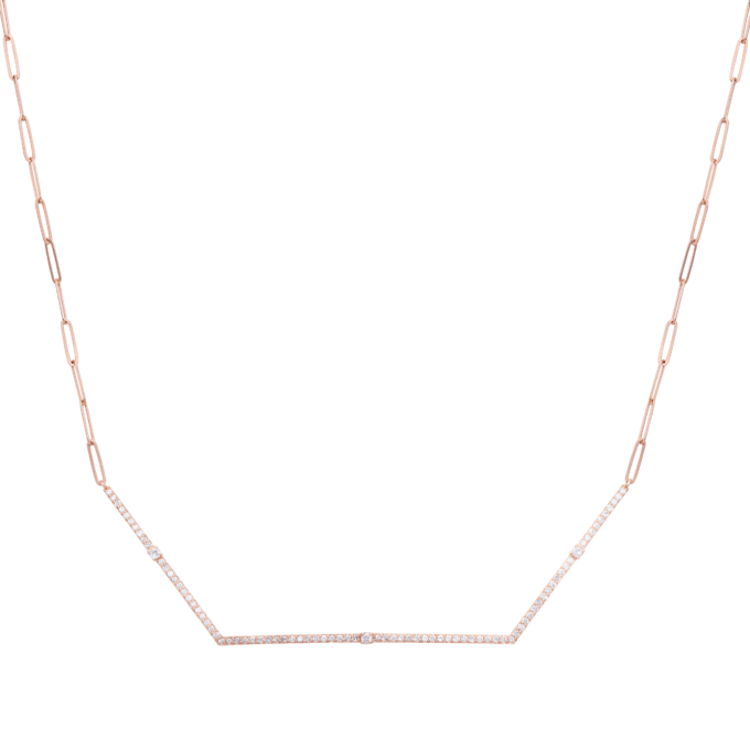Half hexagon shape made into a beautiful necklace, inspired by our logo. This necklace created with round diamonds and 18k rose gold. The second half of the necklace is a simple paper clip chain.