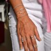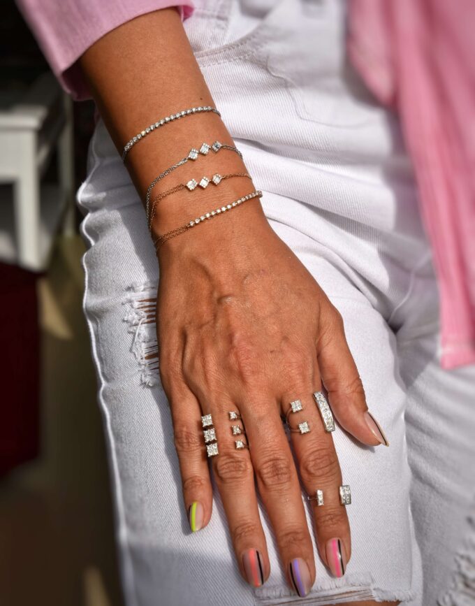 Arm Candy, BraceletAn asymmetrical 18 kt rose gold bangle, with one side beautifully designed with round brilliant stones, while the other side is giving an emerald illusion design using baguette diamonds and round diamonds.
