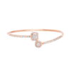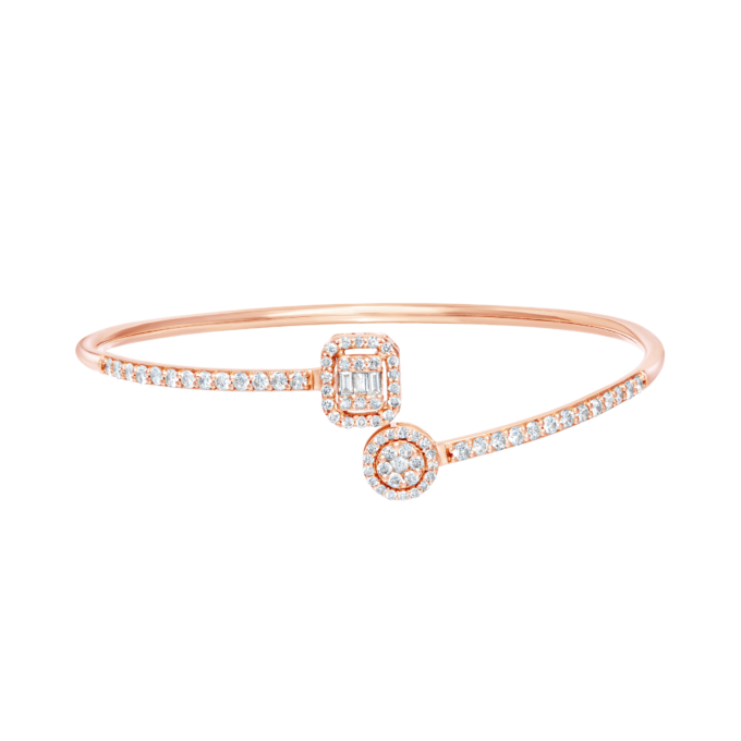 An asymmetrical 18 kt rose gold bangle, with one side beautifully designed with round brilliant stones, while the other side is giving an emerald illusion design using baguette diamonds and round diamonds.