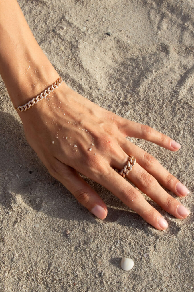 Half Cubin link bracelet and half chain. Designed beautifully with solid 18kt rose gold. Embedded with elegant brilliant cut diamonds.