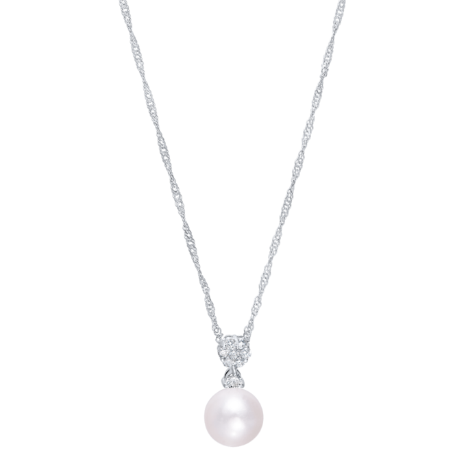 A classic and calming pearl attached to a cute diamond pendent floating on a delicate white gold chain. This chic pendent is beautiful for an every day use.