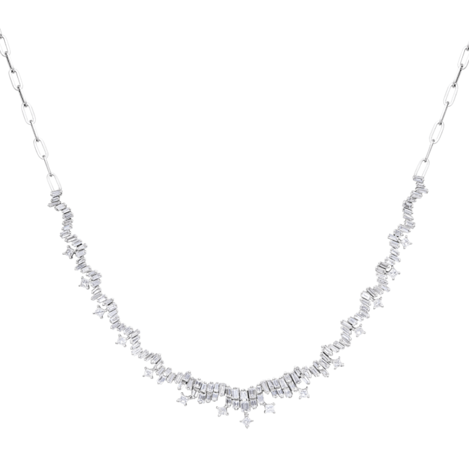 Crushed Necklace, NecklacesOur favourite baguette and princess necklace. This is a show stopper. Its one of the brands most wanted piece. The asymmetrical order of the baguette stones make this necklace a very unique one. The back of the necklace is a paper clip chain, easier to adjust sizes.