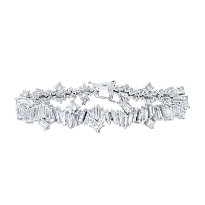 Beautiful tennis bracelet studded with mixed sizes of baguette and princess-cut diamonds. The diamonds are stunningly set in an 18-kt white gold tennis bracelet. This piece is one of the brand’s favorites and is one of the most wanted items from our product list.