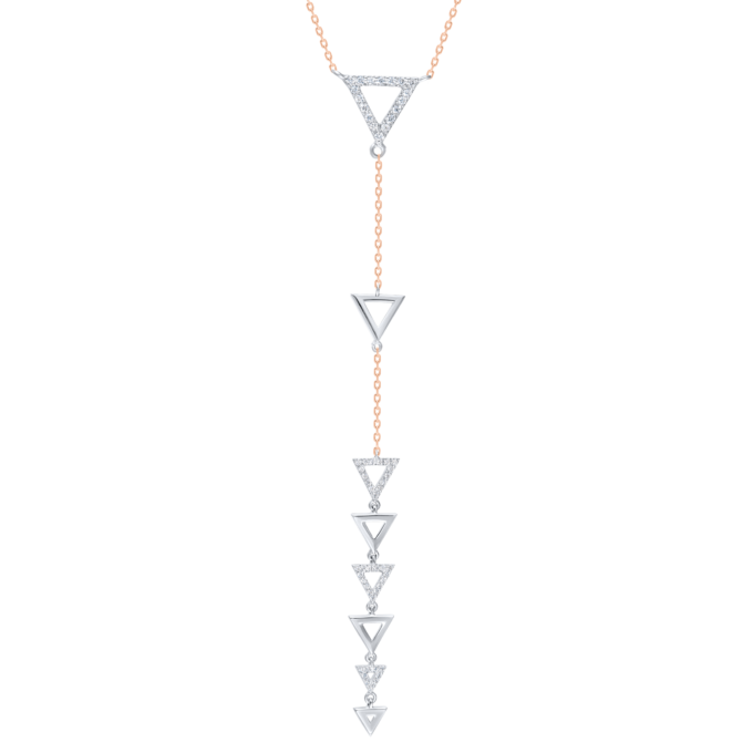 Neck Drips, NecklacesStylish diamond drip with a train of white gold triangle pendents, some embedded with diamonds and others are plain white gold. All triangle pendents are hanging on a delicate 18k rose gold chain. This diamond drip can match with Pyramid asymmetrical earrings.