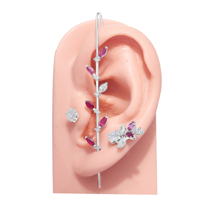 Ear candy, EarringsThe classiest earring a lady can own. This jewellery piece combines a cocktail of marquise cut diamonds, baguette cut diamonds and brilliant cut diamonds. Adding to this magical mix this earring has beautiful Burmese ruby that makes this piece stand out.